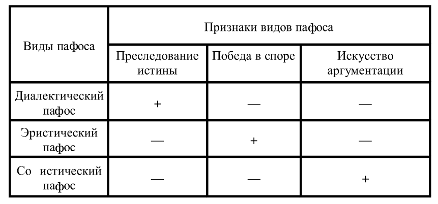 этос --- условные рамки возможного, пафос --- содержание намерения в условных рамках, т. е. те формы мысли, которые можно вложить во временные, обстоятельственные и местные условия речи. В процессе любого диалога в любых рамках существуют три основных направлени пафоса: диалектический, эристический и софистический. Только некоторые виды речи воспрещают этически эристический и софистический пафос. К видам речи, запрещающим эристический и софистический пафосы, относится, помимо античной диалектики, все то, что является ее смысловым продолжением - т. е. молва, проповедь, учебная речь, сфрагистика, нумизматика, эпиграфика, научная литература, все виды рекламы, информатика. Остальные виды речи допускают эристический и софистический пафос, правда, на разных условиях. К ним относятся устный диалог, фольклор, все виды ораторики, пропаганда, эпистолы, документы, сочинения, художественная и журнальная литература, массовая информация. Таблица 2.6 показывает соотношение видов пафоса с его признаками. Таблица 2.6