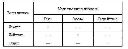 Таблица обнаруживает основные закономерности речевого процесса. Вопрос - монолог, который может завершиться действием, а действие прекращает речь. Повеление тоже может завершатьс действием и, следовательно, тоже прекращением речи. Это значит, что действие есть прекращение речи. Диалог как единица речи имеет границу в виде действия, прерывается действием. Поэтому, как показано в таблице 3.2, жизнь человека во времени распределе на между диалогом, действием и отдыхом. Таблица 3.2