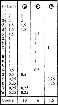 Сила зон рассчитывается подобно тому, как мы рассчитывали силу стихий. Каждая планета имеет свой балл; попадая в ту или иную зону, планета увеличивает суммарный балл зоны. Рассчитаем силу зон на примере карты рождения римского папы Иоанна Павла II (рис. 2.23). Солнце в Тельце, Телец расположен в первой зоне Зодиака, записываем 2 балла в столбец первой зоны напротив Солнца. Луна в Близнецах, Близнецы – первая зона, записываем 2 балла в столбец первой зоны напротив Луны. Меркурий в Тельце, записываем 1,5 балла в столбец первой зоны напротив Меркурия. Венера в Тельце, записываем 1,5 балла в столбец первой зоны напротив Венеры. Марс в Весах, Весы принадлежат второй зоне, записываем 1,5 балла в столбец второй зоны напротив Марса. Продолжаем это делать для всех оставшихся планет, а затем сложим все значения по столбцам. Балл первой зоны наивысший. Подсчитаем, является ли первая зона выделенной. Сравним первую и вторую зоны, для этого общий балл первой зоны разделим на общий балл второй зоны: 10: 6 = 1,67 (это больше чем 1,5). Сравним первую и третью зоны, для этого общий балл первой зоны разделим на общий балл третьей зоны: 10: 1,5 = 6,67. Первая зона сильнее третьей в 6,67 раза.