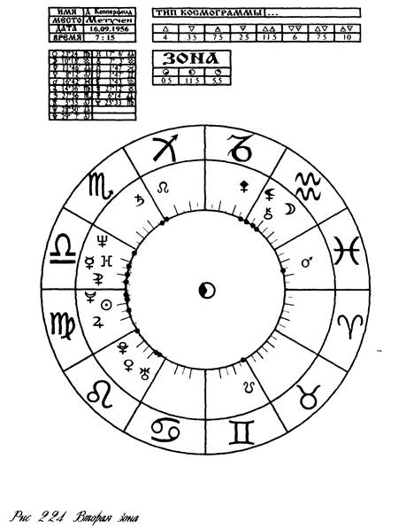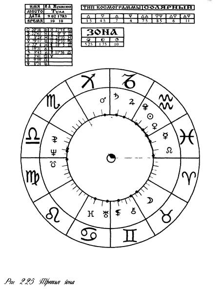 Таким образом, первая зона является выделенной, это означает, что высшая программа Иоанна Павла II связана с активным проявлением и развитием творческих потенций. Будучи римским папой, Иоанн Павел II должен быть хранителем и проводником христианской традиции. Будучи же человеком первой зоны, он не должен ни на кого и ни на что ориентироваться. Он должен творить новую реальность, должен рисковать, не обращая внимания на суд человеческий. Человек первой зоны имеет право на ошибки, излишняя осторожность способна парализовать творческий потенциал. Человек первой зоны должен ярко, резко набросать новый рисунок, провести основные линии, детали пропишут другие. Он должен щедро разбрасывать семена, не заботясь о том, что некоторые могут упасть на бесплодную почву. То есть человек первой зоны в своем творческом акте самодостаточен, эгоистичен. Как эгоистичен Творец Вселенной, творящий в свое удовольствие. Примером выделенной второй зоны является карта рождения иллюзиониста Дэвида Копперфилда (рис. 2.24). Человек второй зоны всю свою деятельность посвящает людям, делает все во имя людей. Он не имеет права разбрасываться своим талантом, он должен заботиться о самых ценных всходах, взращивая достойный урожай. Для него важно наполнить мир содержанием, смыслом, красотой, ёмко и точно отразить детали. Человек второй зоны не должен быть обеспокоен тем, что материальный мир – всего лишь иллюзия, всего лишь отражение высшей, недоступной реальности. Он должен жить среди людей полной жизнью. В лучшем случае он должен стремиться продлить эту иллюзию и сделать ее прекрасней. Третья зона является вьщеленной в карте рождения известного русского поэта Василия Андреевича Жуковского (рис. 2.25). Человек третьей зоны должен быть выше своих личных, эгоистичных амбиций (это прерогатива человека первой зоны), должен быть выше житейских, человеческих забот (это сфера проявления человека второй зоны), он должен мыслить масштабами общечеловеческими, космическими. Человек третьей зоны должен в наше конечное, смертное бытие вносить аромат Вечности.