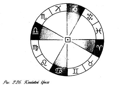 Большинство людей имеют не очень хорошее представление о своей низшей, земной программе по стихиям, а о своей высшей программе задумываются единицы. Воспитание детей в духе и взаимодействие людей на уровне высших программ – явление исключительно редкое. Б повседневной жизни люди практически не взаимодействуют на уровне зон, поэтому их можно не учитывать, когда рассматривается взаимодействие двух людей (родитель и ребёнок, друзья, партнёры, супруги и т.д.). Зоны включаются только тогда, когда человек достигает определённого уровня развития. Это не означает, что при рассмотрении карты рождения обычного человека не следует уделять внимания зонам. Следует. Зона будет задавать направление духовного роста человека, будет определять «верхнюю планку», пусть пока недостижимую, но реально существующую. Очень важно при воспитании ребёнка давать ему высшие ориентиры, дать ему возможность выбирать. Разумеется, насильно никого не заставишь жить по высшей программе, но знать о такой возможности, о существовании высшего пути необходимо. Кресты Зоны и стихии, которые мы с вами уже рассмотрели, описывают высшую и низшую программы развития человека. Для гармоничного развития человека важно реализовать как одну, так и другую программу. Но, как правило, не всегда высшее предназначение человека удаётся совместить с решением обыденных, чисто земных задач. Между высшим и низшим, между духовным и земным лежит пропасть, через которую необходимо перекинуть мост. Каждый человек должен научиться согласовывать свою повседневную жизнь с теми духовными задачами, которые помогут ему обрести устойчивую связь с его высшим духовным началом. Физиология, материальный базис должны быть фундаментом духовного роста человека, а его духовные устремления должны помогать наиболее гармонично проявлять себя в материальной жизни. Таким мостом, соединяющим высшее и низшее в космог–рамме, являются кресты. В космограмме рождения выделяют три креста: 1) ключевой – явный; 2) неподвижный – навный; 3) подвижный – правный. К ключевому (кардинальному, основному) кресту принадлежат следующие знаки Зодиака: Овен, Рак, Весы и Козерог. Их взаимное положение в Зодиаке образует крест (рис. 2.26). К неподвижному (фиксированному) кресту принадлежат знаки: Телец, Лев, Скорпион и Водолей (рис. 2.27). К подвижному (мутабельному) кресту принадлежат знаки: Близнецы, Дева, Стрелец и Рыбы (рис. 2.28). Символическое изображение крестов следующее: ключевой крест изображается как точка в квадрате