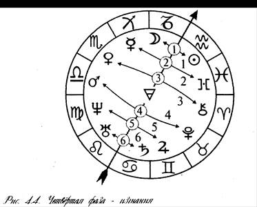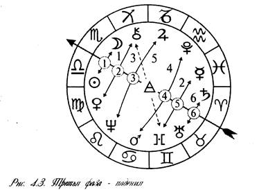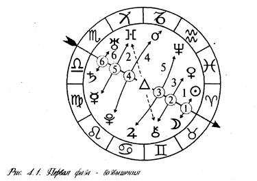 Мы с вами рассмотрели четыре особых положения планет: обитель, изгнание, возвышение и падение. Эти особые положения планет образуют определённую структуру, основанную на взаимодействии планет (Явь) и знаков Зодиака (Навь), на взаимодействии двух космических начал, мужского и женского, образующих универсальную структуру (Правь), которую мы будем называть строем Зодиака. Система обителей–изгнаний красива, устойчива, стабильна (Навь), описывает изначальный потенциал Зодиака, его фундаментальные внешние и внутренние характеристики, поэтому практически без оговорок принимается большинством астрологов. Система возвышений-падений изменчива, динамична (Явь), как мы уже рассмотрели, она описывает процесс эволюции, развития основных (внешних и внутренних) характеристик Зодиака, поэтому её сложнее отследить, и вследствие этого она вызывает непонимание у многих астрологов. Так как эти две системы управлений описывают одну и ту же реальность (Зодиак), то между ними должна быть связь, глубинное взаимодействие. Попробуем установить некоторые взаимосвязи. Зодиак, являющийся символом Вселенной, отражает единство мироздания, в нём преломляются все силы и процессы, происходящие во Вселенной. Зодиак – это живая, развивающаяся система, подчиняющаяся определённым законам и ритмам развития. По отношению к человеку (а астрология всё рассматривает по отношению к человеку) можно выделить четыре фазы проявления Зодиака. Эти четыре фазы связаны с четырьмя схемами управления, которые образуются в результате поворота осиуправлетш. 1. Первая фаза (рис. 4.1) связана со стихией Огонь и системой возвышений. 2. Вторая фаза (рис. 4.2) связана со стихией Земля и системой обителей. 3. Третья фаза (рис. 4.3) связана со стихией Воздух и системой падений. 4. Четвёртая фаза (рис. 4.4) связана со стихией Вода и системой изгнаний.