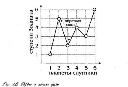 Прямая линия на графике отражает простоту и естественность взаимодействия знаков и планет на уровне обителей. В случае возвышений только три пары планет–спутников остаются на своих местах: это первая пара (Солнце–Луна), последняя пара, шестая (Сатурн–Уран) и четвёртая пара (Марс–Плутон). Три другие пары планет смещаются на более высокие или низкие ступени таким образом, чтобы возникло наибольшее начальное отклонение (амплитуда колебаний), тем самым задаётся наибольшая динамика. Концы «струны» закреплены, первая и шестая пара планет жёстко связаны с первой и шестой ступенями Зодиака, предоставляя определённое пространство для космического действа. Вторая пара со второй ступени поднимается на пятую – это максимальная степень отклонения, доступная для этой пары планет. Третья пара опустилась на вторую ступень, максимально удалившись от второй пары планет–спутников, которая находится на пятой ступени. Четвёртая пара остаётся на своём месте, так как её неизменное исходное положение наилучшим образом обеспечивает возникший колебательный процесс. Четвёртая ступень Зодиака – это неподвижный «узел», центр силы Зодиака. Пятая пара планет опустилась на третью ступень. Таким образом, график (рис. 4.6) отражает колебательный процесс, в котором участвуют шесть пар планет, три пары планет находятся в неподвижных узлах, а три другие пары планет начинают колебания с максимально возможными амплитудами.