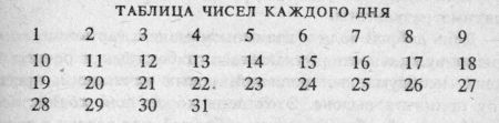 Многие люди убеждены, что у них бывают как хорошие, так и плохие дни. Естественно, они хотели бы знать, как их выбирать, чтобы избежать неблагоприятного влияния плохого дня. В нумерологии каждый день имеет своим образом вибрирующее число, так же как оно имеет число дня рождения и число имени. Берём число дня рождения (5 марта 1946. Сумма 28 = 10 = 1); затем берём число имени человека (…6) и ещё берём число данного дня (допустим, 26 декабря 1972 = 30 = 3). Всё это складываем, сумма 10 = 1 и ключевое число 1. В дальнейшем смотрите следующую таблицу чисел: