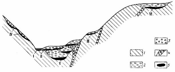 Рис.1. Схема расположения различных типов аллювиальных россыпей. 1 - коренные породы; 2 - аллювий; 3 - склоновые отложения; 4 - источник питания россыпей; 5 - россыпи: I - русловые, II - долинные, III - террасовые, IV -террасоувальные, V - погребенных врезов, VI - приподнятой долинной сети. АЛМАЗНЫЕ РОССЫПИ - см. Россыпи алмазов. АЛМАЗОНОСНЫЕ КОНГЛОМЕРАТЫ - составная часть древних алмазоносных осадочных формаций, важный промежуточный коллектор алмазов, а также самостоятельный промышленный тип ископаемых алмазоносных россыпей. Наиболее распространены А.к. прибрежно-морского и дельтового генезиса, известны А.к. ледникового и водно-ледникового происхождения. Они различаются по степени литифицированности, метаморфизма и дислоцированности. Наряду с алмазом могут содержать другие полезные компоненты; в ряде случаев алмаз извлекается из древних металлоносных конгломератов в качестве попутного компонента (напр., из золото- и ураноносных конгломератов Витватерсранда). А.к. развиты в различных провинциях мира. Наиболее древними среди них являются раннепротерозойские (2,7-2,3 млрд. лет) образования серии Витватерсранд, состоящие из мощных кварцитов с многочисленными внутриформационными конгломератами небольшой мощности (“рифы”). Среднепротерозойские (ок. 1,7 млрд. лет) А.к. представлены образованиями серии Рорайма в Венесуэле, серии Минас-Жакобина в Бразилии и формации Тарква в З.Африке. Достаточно уверенно выделяются также позднепротерозойские (0,96-0,61 млрд. лет) А.к. - серий Виндий, Кудданах и Карнуль в Индии, серии Аделаида в Австралии и тиллиты серии Лаврас в Ю.Америке. Для всех докембрийских А.к. характерны специфические “признаки древности” алмазов: резкое преобладание округлых форм ромбододекаэдрического и октаэдрического габитусов, повышенное содер. кубоидов, наличие скрытокристаллических форм - карбонадо и балласов, зеленая окраска поверхностного слоя кристаллов и пятна пигментации, механический износ зерен, высокая сортность алмазов и др. Примером палеозойских А.к. служат позднекаменноугольные ледниковые образования серии Двайка системы Карру на Африкано-Аравийской платформе, тиллиты свиты Итараре серии Тубаран в Бразилии, а также некоторые образования на СВ Сибирской платформы. Мезозойские А.к. также широко развиты на древних платформах Гондваны, в меньшей мере - Лавразии; в их числе могут быть названы позднетриасовые А.к. Самабула в Зимбабве, позднемеловые А.к. в восточный части Анголы, меловые конгломераты “тауа” в шт. Минас-Жерайс в Бразилии, рэтлейасовые А.к. Сибирской платформы. В р-не Диамантина в Бразилии известны кайнозойские А.к. [46]. АЛМАЗОНОСНЫЕ РОССЫПЕОБРАЗУЮШИЕ ФОРМАЦИИ - формационные типы м-ний и проявлений алмазов, являющиеся источниками питания россыпей. По Н.А.Шило [48], различаются источники россыпей алмазов плутоногенного, метаморфогенного и астрогенного происхождения, однако в природе основные россыпеобразующие источники алмазов - плутоногенные кимберлитовые тела различной морфологии и более древние, преимущественно метаморфизованные россыпи. Источником подавляющего большинства известных россыпей алмазов служат алмазоносные кимберлитовые трубки, имеющие также важное самостоятельное значение как коренные м-ния алмазов. Трубки локализуются на платформах; возраст их от кембрия до позднего мела; размеры в ди