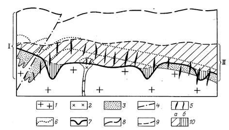 Рис.6. Развитие денудационного среза рудно-россыпных площадей. По Н.Г.Патык-Кара [3]. 1 - граниты; 2 - гранит-порфиры поздней фазы; 3 - контактово измененные породы; 4‑разрывные нарушения; 5 - рудные тела россыпеобразующей формации; 6 - восстановленные геологические граниты; 7 - современная дневная поверхность; 8-9 - палеоповерхности: 8‑периода рудообразования, 9 - в начале экспонирования рудных тел; 10 - денудационный срез: а - предшествующий сохранившимся россыпям, б - синхронный известным россыпям (эрозионный вырез). I- суммарный пострудный срез, II - срез коренных источников ДЕРЕВЯНИСТОЕ ОЛОВО - м-л, разнов. касситерита, свойственная м-ниям малых глубин и приповерхностным м-ниям, прежде всего оруденению риолитовой формации (см. Оловорудные россыпеобразующие формации). Представляет собой грозде-, почковидные и натечные агрегаты тонкокристаллического касситерита с концентрически-зональным и радиально-лучистым сложением, похожие на древесину. Осн. масса Д.о. в россыпях находится в виде обломков и легко определяется по их зональному строению. По сравнению с касситеритом из м-ний др. формаций Д.о. имеет меньшую плотн. (6,2-6,6 г/см3) и лучше сохраняется при транспортировке в водной среде, благодаря чему за счет м-ний риолитовой формации могут формироваться достаточно протяженные россыпи. Однако промышленные россыпи Д.о. встречаются редко и невелики по масштабам, что обусловлено особенностями источников питания. В незначительных количествах Д.о. присутствует в оловянных россыпях, образованных за счет др. типов коренных источников. ДЕСЕРПЦИОННЫЕ И ДЕФЛЮКЦИОННЫЕ РОССЫПИ - подтипы склоновых россыпей, образующихся на склонах при массовом смещении материала, происходящем при соответственно полутвердой и вязко-пластичной консистенциях грунта под влиянием силы тяжести и за счет периодических изменений его объема и консистенции, вызванных переменным увлажнением - высыханием и температурными колебаниями. Типичны для р-нов гумидного литогенеза умеренной и тропической зон, а также перигляциальных р-нов. В р-нах с многолетней или длительной сезонной мерзлотой эти процессы развиваются преимущественно в верхней и средней частях склонов. В умеренных широтах они распространены в основном на склонах крутизной 5-30°. Д. и д.р. характеризуются специфическими текстурными особенностями - грубой слоеватостью за счет наличия гирляндообразных, косовых, петлеобразных прослоев и карманов, различающихся по составу, в частности по насыщенности щебнистым материалом. По-видимому, при сплошной задернованности поверхности основная часть склоновых россыпей создана именно дефлюкционным и десерпционным смещениями. От солифлюкционных россыпей Д. и д.р. в целом отличаются незначительным продольным перемещением материала и несоизмеримо меньшей ролью в питании россыпей в днище долины, особенно при расположении коренных источников в верхней части склонов долин и на водоразделе. Продуктивный пласт Д. и д.р. обычно смещен к основанию разреза склоновых осадков, занимая одну треть - две пятых их мощности. На склонах интенсивного сноса в них происходит относительное остаточное накопление тяжелых м-лов и обломков рудоносных пород за счет больших скоростей перемещения верхних слоев, содержащих меньшее количество полезных компонентов. Своеобразной разнов. остаточных Д. и д.