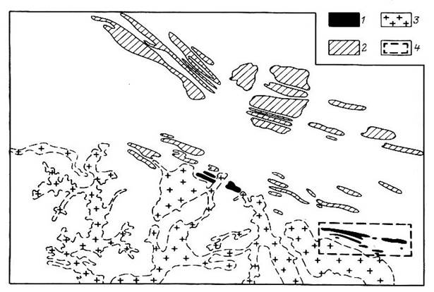 Рис. 7. Характер размещения ископаемых комплексных прибрежно-морских россыпей левобережной части Среднего Приднепровья. По А.Е.Добренькову и др.[10]. 1-2 - россыпи, приуроченные к песчаным отложениям; 1 - среднесарматского подъяруса, 2 - полтавской серии; 3 - кристаллические породы докембрия; 4 - участок промышленного месторождения. ИСТИРАНИЕ (ИЗНОС) ОБЛОМОЧНЫХ ЗЕРЕН - процесс раскалывания, обкалывания, дробления, окатывания и шлифовки обломочных зерен в ходе транспортировки, приводящий к дифференциации материала по механической прочности. Степень и скорость истирания обломочных зерен определяются абразивной прочностью м-лов россыпей, а также длительностью и дальностью переноса и свойствами Среды, обусловливающими величину сил трения, интенсивность, соударений частиц и т.д. По А.А.Кухаренко, степень И.о.з. сильно зависит и от их размеров. В итоге при прочих равных условиях степень И.о.з. прямо пропорциональна кубу диаметра частиц, квадрату скорости перемещения, длине пути и плотн. частиц, но обратно пропорциональна их абразивной прочности. Для каждого м-ла существует критический размер зерен, при котором их окатывание и износ практически прекращаются: в водной среде он составляет напр., для м-лов с плотн. 4-5 г/см3 (циркон, рутил, монацит) 0,05-0,07 мм, а для кварца и близких к нему по плотн. м-лов 0,2-0,25 мм. Сравнение природных объектов и экспериментальных данных свидетельствует о том, что изношенность зерен россыпных м-лов обычно несопоставима с длиной их возможного переноса на протяжении одного цикла. В россыпях ближнего сноса она служит показателем эволюции россыпи. Особенно высокая степень истирания и окатывания зерен россыпных м-лов наблюдается в россыпях дальнего переноса и переотложения, сформированных за счет многократного перемыва и переотложения обломочных зерен на протяжении нескольких циклов. ИСТОЧНИКИ ПИТАНИЯ РОССЫПЕЙ - содержащие россыпеобразующие м-лы горные породы и руды, за счет разрушения которых при благоприятных тектоно-геоморфологических и физико-географических условиях формируются россыпные м-ния и проявления. И.п.р. могут быть эндогенного (плутоногенного), экзогенного, метаморфогенного происхождения и принадлежат практически ко всем известным генетическим группам пород и м-ний полезных ископаемых; весьма подчиненную роль в образовании вещества россыпей играют также источники космогенного (астрального) происхождения (напр., метеоритное вещество). В соответствии с эволюцией поступления россыпеобразующего м-ла в россыпь различают две крупные группы И.п.р. - коренные источники россыпей и промежуточные коллекторы, а в соответствии с особенностями локализации в пространстве - локальные (местные) И.п.р. и региональные (площадные) И.п.р. Для россыпей ближнего сноса и россыпей дальнего переноса и переотложения, а также из разл. минер. видов значение тех или иных И.п.р. существенно отличается. “КАКСА-КАРАНГ” мест. назв. древних аллювиальных россыпей касситерита в Индонезии. Представляет собой слой обломочного материала, состоящего из кварца (80-95 %) и касситерита (2-5 % редко более); залегает на плотике - древней коре выветривания, перекрыт аллювием или морскими осадками песчано-глинистого состава. Формирование “К-к” объясняют длительным перемывом в условиях аллювиальной равнины оловоносных россыпей типа “кулит” и “