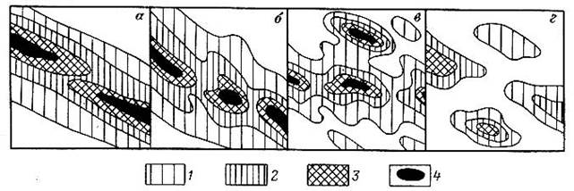 Рис. 20. Характер распределения полезного компонента в россыпи [26]: а- сравнительно равномерное; б - неравномерное с чередованием относительно бедных и обогащенных участков; г - весьма неравномерное. 1-4 значения вертикальных запасов, г/см2 (минимальных к максимальным)