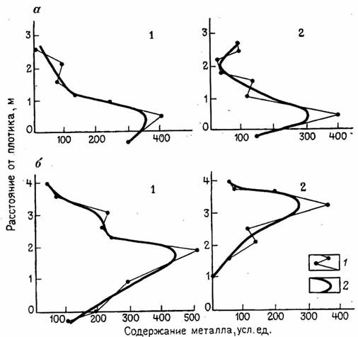 Рис. 23. Распределение полезного компонента в разрезе склоновых россыпей: а - на курумовом склоне (1 - при концентрации мелкозема в основании курумника, 2 - при конвективном перемешивании материала), б - на солифлюкционном склоне (1 - наиболее характерное для участков транзита материала, 2 - во фронтальной части солифлюкционной террасы). По Н.Г.Патык-Кара. 1 - реальное распределение; 2 - обобщенная кривая СЛОЖНЫЕ РОССЫПИ - отдельные авторы употребляют как син. Многопластовых россыпей. Изл. термин. СМОЧЕННЫЙ ПЕРИМЕТР Rм - длина подводного контура поперечного сечения водного потока. СОВРЕМЕННЫЕ РОССЫПИ - термин не имеет строгого возрастного значения. Некоторые авторы под С.р. подразумевают все россыпи четвертичного возраста. Более правильной представляется др. точка зрения, согласно которой к С.р. относят россыпи голоценового возраста. СОГЛАСНЫЕ РОССЫПИ - россыпи, вытянутые в соответствии с простиранием долины. СОДЕРЖАНИЕ ПОЛЕЗНОГО КОМПОНЕНТА В РОССЫПИ - один из основных показателей качества песков (горной массы). Выражается в единицах массы (кг, г, кар) на 1 м3 песков или горной массы. СОЛЮФЛЮКЦИОННЫЕ РОССЫПИ - подтип склоновых россыпей, формирующихся на склонах массового смещения обломочного материала, происходящего при жидко- или вязкотекучей консистенции грунта. С.р. особенно характерны для зоны крикогенеза, где движению масс способствует значительная водонасыщенность обломочного материала в условиях переменного промерзация - увлажнения, а также для тропических р-нов, где обогащенные мелкоземом массы движутся в условиях переменного намокания - просыхания. При послойном оттаивании пород развивается конжелефлюкционное смещение, выражающееся в чередовании прослоев грунта с вязкотекучей и вязко-пластинчатой консистенцией. Собственно С.р. наибольшее значение имеют в р-нах распространения многолетнемерзлых пород в частности на севере Сибири, в р-нах крайнего Северо-Востока СССР, на Аляске. От других подтипов склоновых россыпей С.р. отличаются при прочих равных условиях большим выравниванием состава в силу значительного перемешивания материала, большей протяженностью по склону и растянутостью пласта по вертикали. С.р. по сравнению с др. склоновыми россыпями играют главную роль в питании долинных, террасовых, ложковых россыпей за счет источников, расположенных на склоне, т.к. перемещение полезного компонента от локального коренного источника в С.р. может составлять многие сотни метров и более. Для горных районов, где преобладает крупноглыбовый обломочный материал, весьма характерны также курумово-солифлюкционные россыпи, состоящие из чередования участков обогащенных мелкоземом или глыбовым материалом. СОРТИРОВАННЫЕ РОССЫПИ - по Ю.А.Билибину [2], россыпи, образованные путем водного или ветрового переноса, сортировки и накопления ценных и выноса легких породообр. м-лов (аллювиальные, дельтовые, озерные, морские и эоловые россыпи). СОСТАВНАЯ РОССЫПЬ - по Б.В.Рыжову, россыпь, состоящая из нескольких элементарных россыпей. Изл. термин. “СПАЙ” - четкий контакт рыхлых отложений с породами плотика, на котором наблюдаются повышенная концентрация тяжелых м-лов. Является благоприятным местом для взятия шлиховой пробы. СПЕЦИАЛИЗИРОВАННЫЕ КАРТЫ РОССЫПЕЙ - карты россыпной минерализации, составленные на специализированной основе, отражаю