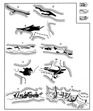 Рис. 28. Формы россыпи в плане. По Ю.Н.Трушкову. Россыпи: а - одноструйчатая, б - лентообразная, в - линзовидная, г - четковидная, д - гнездовая, е ‑ изометричная, ж - неправильной формы, з - многоструйчатая, и - расчлененная по террасовым уровням. 1 - россыпи; 2 - контуры долин; 3 - бровки террас ФОРМАЦИОННЫЙ МЕТОД - в приложении к россыпям представляет собой комплексное изучение осадочных толщ с целью выявления формаций, особенности образования которых обусловливают возможность накопления россыпных м-лов в определенных литолого-фациальных комплексах отложений. Последние могут быть приурочены к конкретным стратиграфическим горизонтам или занимать разл.стратиграфическое (и площадное) положение. Осадочные формации выделяются для территорий с однотипным тектоническим режимом; их возникновение связано с определенными ландшафтно-климатическими условиями. Ф.м. обычно применяется в сочетании с литолого-фациальным анализом и имеет важное значение для выяснения закономерностей распространения преимущественно древних россыпей разл.полезных ископаемых и разработки научных основ их поисков. Примерами теоретических разработок и практического применения Ф.м. могут служить исследования В.П.Казаринова и др. в области литолого-формационного анализа, Г.С.Момджи, предложившего метод выделения продуктивных формаций переотложенной коры выветривания. ФОРМУЛА СТОКСА - формула скорости падения частицы в жидкости: v = [Kgr2(p’-p)]/m, где v - скорость падения; g - ускорение свободного падения; r. - радиус частицы; p’ - плотн. вещества частицы; p - плотн.жидкости; m - коэф.вязкости жидкости. Коэф. К зависит от формы частицы и приблизительно равен 0,222 для шаров, 0,143 для дисков и 0,040 для чешуек. ФОРМУЛА ШЕЗИ - выражает зависимость средней скорости потока от основных влияющих факторов для равномерного движения воды в речном русле: v = СÖRI, где v ‑ средняя скорость потока, м/с; С - коэф. Шези, являющийся интегральной характеристикой сил сопротивления, действующих в речном русле; R - шидравлический радиус потока, примерно равный средней глубине потока, м; I - уклон потока. ФРАКЦИИ МИНЕРАЛОВ - группы м-лов, обладающих близкими свойствами: плотн., размерами, магнитностью, электропроводимостью и т.п. Выделение фракций применяется при изучении шлихов, а также для разделения коллективных концентратов при промышленной переработке песков. Важнейшей операцией при обработке шлихов является разделение на легкую и тяжелую фракции с помощью тяжелых жидкостей; в свою очередь, в тяжелой фракции различают магнитную, электромагнитную и немагнитную фракции. Иногда электромагнитная фракция дополнительно разделяется на “слабую” и “сильную”. Кроме того, широко применяется расситовка материала на гранулометрические фракции. Для фракционирования используют также различия в электропроводности и диэлектрической постоянной м-лов. ХАЛЦЕДОН - м-л, скрытокристаллическая тонковолокнистая, обычно полупрозрачная или просвечиваюшая разнов.кварца. Тв. 6,5-7,0; плотн. 2,57-2,64 г/см3. Х. устойчив в экзогенных условиях. Слагает миндалины, жеоды, гнездо-, жило- и трубообразные тела размером от первых до нескольких десятков сантиметров в поперечнике. По цвету выделяют следующие разнов.: собственно Х. - бледные тона серого, голубоватого, зеленоватого, желтоватого или желтовато-бурого цвета; карнеол - красный, буро