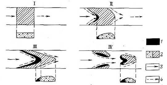 Рис. 29. Характер концентрации тяжелых минералов в передвигающейся гряде аллювия. По Н.В.Разумихну и З.Н.Тимашковой [10]. 1 - тяжелая фракция; 2 - легкая фракция; 3 - направление течения; 4 - пути движения наносов ЭКСПЛУАТАЦИОННАЯ РАЗВЕДКА РОССЫПЕЙ - см. Стадийность геологоразведочных работ. ЭКСПЛУАТАЦИОННОЕ ОПРОБОВАНИЕ - одна из главнейших операций, проводимых геол. службой эксплуатационных предприятий. Э.о. базируется на тех же принципах, что и опробование при поисках и разведке. Особенность Э.о. - четкое разделение на оперативное и систематическое. Задачей оперативного опробования является ориентировочное определение содер. полезных компонентов в отдельных участках россыпи с целью правильного направления горных работ, предварительного контроля качества вскрыши, оперативного контроля технологических потерь. Систематическое Э.о. осуществляется для уточнения границ отработки, установления мощности торфов, песков или горной массы, содер. и характера распределения полезных компонентов, контроля за работой обогатительных устройств. На основании данных систематического Э.о. подсчитываются запасы, учитываются потери и разубоживание, оформлются акты на отработку площадей, консервацию и ликвидацию работ, составляются разл.планы, проекты и отчетные документы. При необходимости в комплекс горно-эксплуатационных работ входит также специальное (техническое) и технологическое опробование. Наряду с разл. способами опробования, применяющимися при поисках и разведке россыпей, при Э.о. используется горстевое опробование разрыхленной горной массы. При вскрыше торфов опробование ведется в основном лунками и копушами. Борта разрезов опробуютсяs бороздовым способом через 10-20 м, а поздемные выработки - бороздовым, валовым, горстевым и задирковым способами. Перед прекращением эксплуатационных работ для актировки отработанных площадей в разрезах опробуется полотно, а в подземных горных выработках - кровля и полотно; опробование осуществляется лунками, копушами или задирками, расположенными по 5- или 10-метровой маркшейдерской сетке. ЭЛЕКТРУМ м-л, AuAg; разнов. золота (самородного), природный сплав золота и серебра с содер. Ag от 25 до 75 %. В целом в россыпях редок, однако в россыпях отдельных р-нов может присутствовать в значительном количестве. Напр., находки Э. (в т.ч. в виде самородков) в аллювии некоторых рек Малой Азии (Тмала, Синила, Пактола) известны начиная с VII в. до н.э. ЭЛЕМЕНТАРНАЯ РОССЫПЬ - по Н.А.Шило, россыпь, образованная за счет одного локального источника питания. По длине аллювиальный Э.р. обычно четко различают зоны нарастания, максимума и спада продуктивности. Иногда Э.р. не совсем удачно называют простыми россыпями. ЭЛЛЮВИАЛЬНО-ДЕЛЮВИАЛЬНЫЕ РОССЫПИ - отдельные авторы употребляют как син. термина Элювиально-склоновые россыпи. ЭЛЮВИАЛЬНО-КАРСТОВЫЕ РОССЫПИ - разнов. элювиальных россыпей в р-нах развития карстового рельефа. Локализуются в карстовых западинах и формируют изометричные залежи. Представлены в осн. россыпями кор химического выветривания. Э.-к.р., как правило, генетически неоднородны, т.к. по мере заполнения карстовых понижений элювий перемешивается с образованиями иного генезиса. Известны промышленные Э.-к.р. золота, касситерита, тантало-ниобатов, алмазов и др. ЭЛЮВИАЛЬНО-СКЛОНОВЫЕ РОССЫПИ - гетерогенные россыпи, образующие