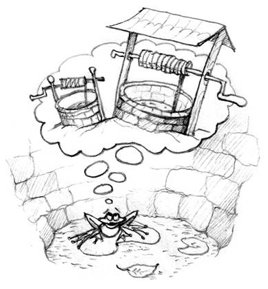В колодце, неподалеку от океана, жила лягушка. Она провела там всю свою жизнь и ничего кроме этого колодца не видела. Несмотря на это, она была очень напыщенным созданием. Лягушка считала себя полновластной хозяйкой колодца, она даже думала, что весь мир – это и есть колодец, и потому считала себя Богом этого мира! И вот однажды, с берега моря, к ней забрела другая большая лягушка. Она хотела перепрыгнуть через него, но случайно свалилась вниз. Сначала колодезная лягушка приняла морскую за новую жертву и кинулась на неё, но поняла, что это тоже представитель лягушачьего рода, хоть и немного другого вида. – Ты откуда? – спросила она. – С берега моря. Услышав это, колодезная лягушка спросила: