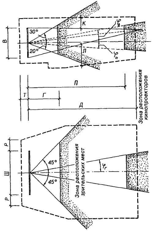 Места для зрителей в зрительных залах при традиционной кинодемонстрации рекомендуется предусматривать в пределах зоны, изображенной на рисунке Е.1, где: Д - длина зрительного зала по его оси от экрана до спинки последнего ряда; Г - расстояние по оси зрительного зала от киноэкрана до спинки первого ряда; Г = 0,36 Д. Размеры киноэкрана показаны на чертеже, где: Ш - ширина рабочего поля киноэкрана (криволинейного по хорде); В - высота рабочего поля экрана. Соотношения В и Ш принимаются: Ширину экрана Ш в зависимости от длины зрительного зала Д рекомендуется принимать: Ш ф = 0,6 Д (0,54 Д)2 Ш ш = 0,43 Д (0,39 Д) Ш к = 0,34 Д (0,3 Д) Ш о = 0,25 Д (0,22 Д) Расстояние от экрана до спинки первого ряда Г в зависимости от ширины экрана Ш рекомендуется принимать: Г ф не менее 0,6 Ш ф Г ш не менее 0,84 Ш ш Г о не менее 1,44 Ш о Радиус кривизны киноэкрана принимается не менее Д. Параметры зрительного зала при установке кинопроекционного оборудования показаны на рисунке Е.1, где: П - проекционное расстояние3 - не менее 0,85 Д; ф - угол отклонения оптической оси кинопроектора от нормали в центре киноэкрана: фг - не более 7° 4 фв - не более 8° фн - не более 3°; К - расстояние от верхнего проекционного луча до ближайших поверхностей потолка - не менее 0,6 м; Л - расстояние от нижнего проекционного луча до пола в зоне зрительных мест - не менее 1,9 м; Т - глубина заэкранного пространства5: при широком экране - 0,9 м; при широкоформатном экране - 1,5 м; Р - расстояние от края экрана до стены: при плоском экране - не менее 0,985 м; при закругленном экране - не менее 0,1 Ш. При построении видимости на расчетную точку наблюдения6 превышение луча зрения, направленного на эту точку, над уровнем глаза впереди сидящего зрителя рекомендуется принимать 0,14 м (при реконструкции возможно 0,12 м). Высота уровня глаза сидящего зрителя над уровнем пола принимается 1,2 м. _____________ 1 Индексы при параметрах Ш, В и Г обозначают экраны: ф - широкоформатный, ш - широкий, к - кашетированный, о - обычный. 2 Данные в скобках - для кинотеатров сезонного действия, клубов и театров. 3 При использовании отечественного кинопроекционного оборудования - не более 34,5 м. 4 В клубах и театрах допускается принимать не более 9°. 5 При одноканальном воспроизводстве звука или при расположении громкоговорителя по сторонам экрана допускается 0,1 - 0,3 м. 6 В кинотеатрах - нижняя кромка киноэкрана.