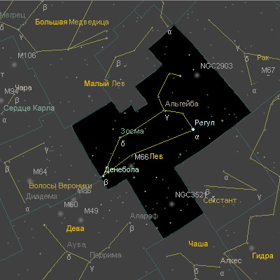 Лучшее время для наблюдения на территории России — февраль, март. Лев (лат. Leo) — зодиакальное созвездие северного полушария неба, лежащее между Раком и Девой. Расположение ярких звезд действительно напоминает лежащего льва, голова и грудь которого представляют известный астеризм «Серп», похожий на зеркально отражённый вопросительный знак. «Точкой» внизу этого знака служит яркая бело-голубая звезда Регул (α Льва), что по-латински значит «царек». Иногда ее называют также «Сердце Льва» (Cor Leonis). Светимость Регула в 160 раз выше солнечной, а высокий видимый блеск (1,36 звездной величины) объясняется относительной близостью к нам (85 св. года). Среди звёзд первой величины Регул ближе других расположен к эклиптике, поэтому его довольно часто покрывает Луна. В задней части фигуры зверя находится звезда Денебола (β Льва), в переводе с арабского — «хвост льва». Она имеет блеск 2,14 звездной величины и удалена всего на 43 св. года. В основании «головы льва» расположена золотисто-желтая Альгиеба (γ Льва), что значит «грива льва». Это тесная визуальная двойная 2,0 звездной величины. R Льва — одна из ярчайших долгопериодических переменных, изменяющая блеск от 5 до 10-й величины. Очень слабый красный карлик Вольф 359 (видимый блеск 13,45) — третий среди ближайших звезд (расстояние 7,80 св. лет); его светимость в 100 000 раз меньше солнечной. Если бы эта звезда заняла место нашего Солнца, то в полдень на Земле было бы немногим светлее, чем теперь в полнолуние. Среди далёких объектов в этом созвездии интересны спиральные галактики М 65, М 66, М 95 и М 96, а также эллиптическая галактика М 105, лежащая вблизи последних двух спиральных. Их видимый блеск от 8,4 до 10,4 звёздной величины. Астеризм «Серп» Астеризм Серп состоит из шести звёзд созвездия — α (Регул), η, γ (Альгиеба), ζ, μ и ε (Альгенуби). Формой напоминает серп или зеркально отражённый вопросительный знак. Date: 2015-06-07; view: 1838; Нарушение авторских прав |