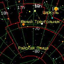 Лучшее время для наблюдения на территории России — не наблюдается. Райская Птица (лат. Apus), околополярное созвездие Южного полушария неба. Площадь — 206 квадратных градусов; содержит 20 звёзд видимых невооруженным глазом. Звезды Вопреки названию, это созвездие тускло и малопривлекательно. Наибольший интерес представляет S Райской Птицы (S Aps), которая относится к группе звезд типа R Северной Короны. Блеск этой звезды ослабевает с 10 до 15m (то есть в 100 раз); причем в этих колебаниях обнаруживается регулярность с периодом около 113 суток. Астрономы подозревают, что причиной ослабления блеска таких звезд служит конденсация в их атмосфере вещества, похожего на сажу. Этому способствует избыток у них углерода и невысокая температура атмосферы. Время от времени черные облака затягивают небеса этих звезд, скрывая от нас их яркую фотосферу. δ Райской Птицы — визуально двойная звезда, состоящая из красного и оранжевого гигантов. Происхождение названия Новое созвездие. Предложено Петером Планциусом в 1598 году, но традиционно приписывается Иоганну Байеру (1603). Любопытно, что китайцы издревле назвали его Маленькой Чудо-Птицей.