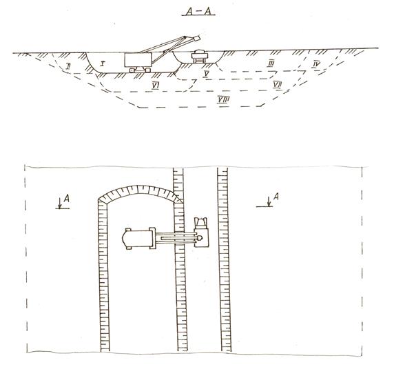 Рис. 7.2. Боковая проходка траншеи при различных уровнях стоянки экскаватора и проезда транспорта: I …VIII - последовательность проходки