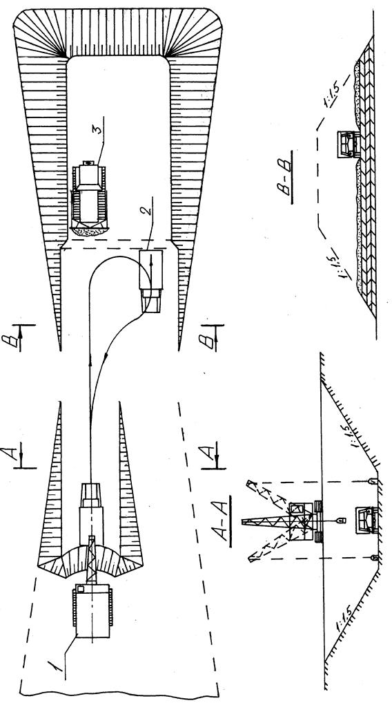 При продольном перемещении драглайна по оси выемки образуется лобовая проходка трапецеидального сечения с откосами крутизной около 45°. При двустороннем расположении кавальеров экскаватор сначала разрабатывает одну половину забоя, отваливая грунт с этой же стороны, затем – другую, а на отвале попеременно то справа, то слева работает бульдозер, формирующий кавальер. Объем грунта в односторонних отвалах определяют, ориентируясь на удобство работы бульдозера. Наряду с рассмотренной лобовой проходкой выемки драглайном на полную глубину возможна и асимметричная лобовая проходка. В этом случае экскаватор смещают в сторону одного из откосов выемки, где он может нормально отрабатывать под углом около 45° лишь один, ближний к нему борт. Противоположный борт приобретает довольно большую крутизну, общий путь копания снижается и глубина его оказывается меньшей, чем при лобовой проходке. Однако она ограничивает и глубину разрабатываемой траншеи, которая существенно уменьшается. Вместе с тем при асимметричной лобовой проходке удается разместить за бортом траншеи отвал значительного объема, грунт из которого может быть уложен в кавальер позднее, независимо от разработки траншеи. Применимость асимметричной лобовой проходки целесообразна при небольшой глубине выемок. Для обычных драглайнов с ковшами вместимостью 0,8…1,5 м3 глубина выемок должна сооставлять примерно 2,5…3,5 м. Такая глубина обусловлена возможностью размещения отвалов на борту траншеи. Вместе с тем драглайн при подобной глубине за счет большой ширины траншеи способен разработать основную часть сечения выемки. Оставшийся неразработанным массив за крутым бортом он может выбрать при работе с противоположной стороны боковой проходкой. При работе с погрузкой грунта в автосамосвалы наиболее производительным является продольный способ, называемый челночным. При установке автосамосвалов на верхней отметке забоя сбоку или позади экскаватора средний угол поворота составляет от 90° и выше; ковш, опущенный в забой, приходится поднимать на большую высоту, что значительно увеличивает время цикла. Челночный способ предусматривает установку автомашин под погрузку на дне забоя с набором грунта ковшом экскаватора первоначально с обеих сторон автосамосвала. Грунт набирается сначала с одной стороны автосамосвала (1-е и 2-е положение ковша), затем загруженный ковш подается на разгрузку (3-е положение ковша), которая осуществляется на ходу или с непродолжительной остановкой ковша над кузовом автосамосвала; после разгрузки движение продолжается в том же направлении и ковш снова опускается для набора, но уже с другой стороны автосамосвала (4-е и 5-е положение ковша), а потом загруженный ковш снова подается на разгрузку (6-е положение ковша) с последующей подачей его с другой стороны автосамосвала. Такая схема работы, называемая поперечно-челночной (рис. 7.4), позволяет сократить величину подъема загруженного ковша на глубину забоя при загрузке автосамосвала, производить разгрузку ковша на ходу, вести работу с углами поворота стрелы не более 15°, разрабатывать забой максимальной ширины, чем сокращается число передвижек экскаватора. При достижении между задним (торцовым) бортом кузова и торцовой стенкой проходки расстояния, позволяющего набирать грунт, копание производится перед з