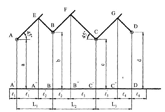 Расчет транспортной схемы заключается в определении участков трассы, обслуживаемых отдельными пунктами поступления труб и материалов, Дальность их возки и других данных (приложение 1). Кратчайшие расстояния от пунктов поступления материалов А, В, С и D до трассы трубопровода соответствуют значениям а, b, с и d. Расстояние по трассе трубопровода между точками выхода на нее дорог от пунктов поступления А, В, С и D соответствуют значениям Графический метод определения рациональных границ участков обслуживания заключается в нахождении точек пересечения прямых АЕ и BE, BE и СЕ, CG и DG и т.д., которые проводятся через точки А, В, С и D и т.д. под углом 45° к горизонтали. Проекции точек пересечения указанных прямых на горизонтальную линию расчетной схемы, соответствующее трассе трубопровода (A', D') дают искомые границы обслуживания пунктами поступления материала A ", В", С" Расчеты обычно выполняют в такой последовательности: 1.Определяют среднюю дальность возки труб и их секций. Для этого необходимо установить рациональные границы участков обслуживания каждым пунктом поступления одиночных труб. Можно использовать как графический, так и аналитический метод. Используя аналитический метод, рациональные границы обслуживания между первым и вторым пунктами поступления труб определяют по формулам: