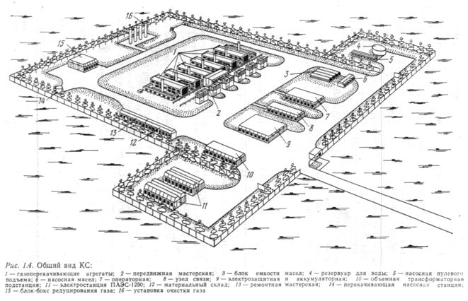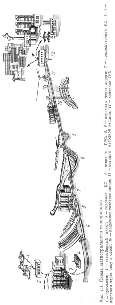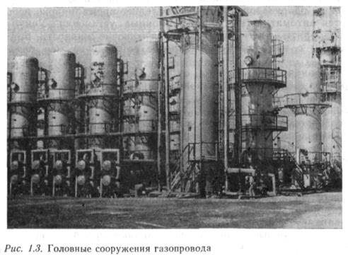 Магистральный газопровод в общем случае включает следующие группы сооружений (рис. 1.1): головные, линейные (собственно газопровод), компрессорные станции (КС), газораспределительные станции (ГРС) в конце трубопровода, подземные хранилища газа (ПХГ), объекты связи (высокочастотной и селекторной), системы электрозащиты сооружений трубопровода от коррозии, вспомогательные сооружения, обеспечивающие бесперебойную работу газопровода (линии электропередач, водозаборные устройства и водопроводы, канализация и т. п.), объекты ремонтно-эксплуатационной службы (РЭП), административные и жилищно-бытовые сооружения. Головными называют сооружения, на которых подготавливают газ к дальнему транспорту. Комплекс головных сооружений (ГС) зависит от состава и давления газа, добываемого на промысле и поступающего на газосборный пункт. Как правило, в комплекс ГС входят установки по очистке газа от меха Жидкие примеси, скапливаясь в пониженных местах газопровода, будут сужать его сечение, способствовать образованию гидратных и гидравлических пробок. Для очистки газа от механических примесей используют горизонтальные и вертикальные сепараторы, цилиндрические масляные и циклонные пылеуловители. В сепараторах отделяется примесь от газа. По принципу действия сепараторы делятся на объемные (гравитационные) и циклонные. В гравитационных аппаратах примеси оседают вследствие резкого изменения направления потока газа при одновременном уменьшении скорости его движения. В циклонных установках используются центробежные силы инерции, возникающие в камере при входе газа по тангенциальному вводу. Масляные цилиндрические пылеуловители представляют собой вертикальные цилиндрические сосуды со сферическими днищами. На головных сооружениях магистральных газопроводов их устанавливают группами в зависимости от необходимой пропускной способности. Размеры пылеуловителей: по диаметру от 1000 до 2400 мм, по высоте от 5,8 до 8,8 м. В пылеуловителе имеются устройства, обеспечивающие контактирование газа с маслом и отделение твердых и жидких частиц от газа. Оседающий в пылеуловителе шлам периодически удаляют, загрязненное масло заменяют. Осушку газа на головных сооружениях осуществляют двумя способами: абсорбционным (с жидким поглотителем) и адсорбционным (с твердыми поглотителями). Газ после пылеуловителей попадает в абсорберы, где очищается от взвешенных капель жидкости и водяных паров путем активного контакта с абсорбентом, чаще всего диэтиленгликолем. В последнее время определенное значение приобретает осушка газа твердыми поглотителями. В качестве адсорбентов применяют активированную окись алюминия, флюорит, боксит, силикагель или другие реагенты. Установка такой осушки состоит из группы адсорберов (не менее двух), подогревателя газа и теплообменников. Влажный газ после очистки от пыли поступает в адсорбер, где проходит через один или несколько слоев адсорб-бента. Периодически часть адсорберов отключают от системы для регенерации адсорбента. Для отделения от газа конденсата и воды с успехом используют низкотемпературную сепарацию, особенно при отборе газа из месторождений с высоким пластовым давлением. Газ из скважин без дросселирования подводят к установке и направляют во влагосборник для предварительной очистки. Затем в теплообменнике