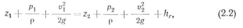 где z — положение центра живого сечения жидкости над плоскостью сравнения (рис. 2.1); р — гидродинамическое давление в жидкости; v — скорость движения жидкости; р — плотность жидкости; g — ускорение свободного падения. В реальной жидкости при движении возникают силы трения; вследствие работы, затрачиваемой на преодоление сил трения, энергия жидкости должна уменьшаться вдоль трубопровода по направлению течения. Следовательно, уравнение (2.1) для реальной жидкости не будет действительным. В уравнении (2.1) необходимо учесть потери энергии вдоль трубопровода. В соответствии с интерпретацией отдельных составляющих полной энергии потока в (2.1) обозначим составляющую, учитывающую потери на трение, hr. Тогда для двух различных сочетаний уравнение движения жидкости, которая называется реальной, записывается в виде