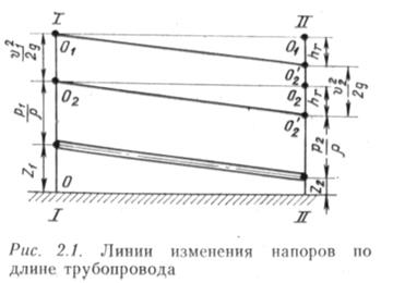С энергетической точки зрения hr является мерой удельной энергии, теряемой на выполнение работы по преодолению сил трения на пути от сечения I—I до сечения II—II. Падение напорной линии, приходящееся на единицу длины, называют гидравлическим уклоном и обозначают как