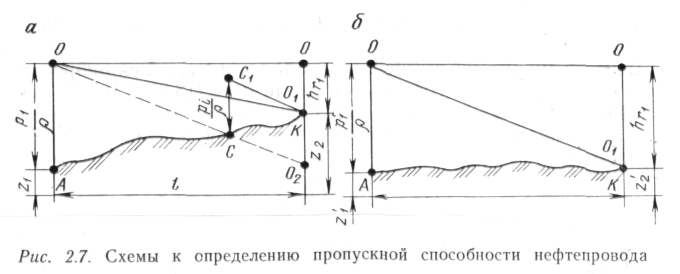 Рассмотрим одну из важнейших особенностей течения жидкости по трубопроводу, определяющую гидравлический режим трубопровода при заданных пропускной способности Q, длине l и внутреннем диаметре D вш трубопровода. Пусть заданы два продольных профиля участков местности, по которым должны быть проложены трубопроводы одинакового диаметра из точки А в точку К (рис. 2.7). Давление, создаваемое на выходе из НС, одинаково на обоих трубопроводах и равно р. Давление в точке К — атмосферное, т. е. р2 = 0. Если бы перекачивалась идеальная жидкость, то линия гидравличо ского уклона в обоих случаях была бы горизонтальной 00. Поскольку нефть является жидкостью реальной, то по длине трубопровода происходит уменьшение начального давления р или напора р/ р, обусловленное потерями напора на трение. Соответственно в обоих случаях линии гидравлического уклона будут иметь вид, изображенный на рис. 2.7 сплошной линией 001. По схеме рис. 2.7,6 напор, созданный в начальной точке Л, обеспечивает компенсацию потерь напора на трение и всех подъемов рельефа, а по схеме рис. 2.7, а линия гидравлического уклона встречается с линией трубопровода в точке С. Проанализируем этот случай. Чтобы нефть пришла в конечный пункт, потери напора на трение должны быть уменьшены так, чтобы линия гидравлического уклона по крайней мере коснулась точки К (линия 001 на рис. 2.7, а). В соответствии с (2.2)