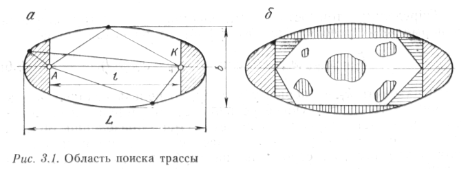 Пусть необходимо найти наилучшую по какому-либо критерию трассу между двумя точками А и K. Очевидно, что имеется множество путей соединения этих точек трубопроводом, но найти нужно лучший. Однако еще до поиска оптимальной трассы необходимо ограничить область поиска такой трассы с тем, чтобы уменьшить объем исходной информации. Но при этом она должна быть такой, чтобы в ней обязательно находилась лучшая трасса, а за ее пределами любая трасса была заведомо худшей. При определении области поиска могут использоваться два основных метода: метод среднестатического коэффициента развития линии трубопровода и метод сравнения со стоимостью трубопровода по геодезической прямой. Суть первого метода заключается в следующем. Как показывает весь предшествующий опыт проектирования и строительства трубопроводов, действительная длина магистрального трубопровода, как правило, больше прямой, соединяющей начальную и конечную точки трассы. Это объясняется тем, что на пути магистрального трубопровода встречаются различные препятствия, которые необходимо или целесообразно обойти. Отклонение трассы от прямой будет тем больше, чем больше встречается препятствий. Обо значим расстояние между начальной и конечной точками трубопровода по геодезической линии l, длину реальной трассы L. Допустим, что коэффициент развития линии kP