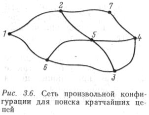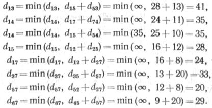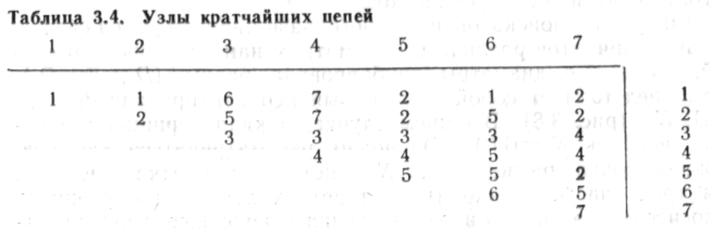 на ЭВМ. Следует отметить, что метод позволяет также сохранять произвольность распределения пометок графа. Рассмотрим работу алгоритма нахождения кратчайших цепей между всеми парами узлов (рис. 3.6). Условимся, что дуги графа не ориентированы. Длины дуг отрезков сети заносятся в таблицу. Выполняем операции (3.12) (для j=1), заключающиеся в том, что определяются все элементы табл. 3.2, не лежащие в первой строке и в первом столбце. Длины кратчайших цепей заносятся в табл. 3.3, а узлы прохождения пути — в табл. 3.4;