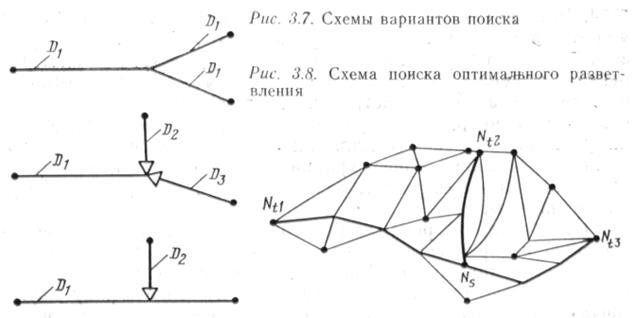 (1,7) =2 и (1,2) = 1. Следовательно, кратчайшая цепь из N1 в jV4 проходит через узлы N2 и N7 Таким образом, пользуясь построенной табл. 3.4 для нахождения кратчайших цепей между любыми двумя парами узлов, достаточно выполнить лишь некоторое число операций сравнения, равное числу дуг в искомом кратчайшем пути. Это дает существенные преимущества рассматриваемому методу, поскольку в предыдущих алгоритмах для отыскания кратчайшего пути из какой-либо точки необходимо строить дерево относительно этой точки, что при переборе начальных и конечных точек на сети представляет трудоемкий процесс. 3. Проблема выбора оптимального разветвления трубопровода состоит не только в поиске оптимальных трасс участков между двумя пунктами, но и в определении места оптимального разветвления при отборе или притоке перекачиваемого продукта. Для решения данной задачи будем исходить из следующих предпосылок. Сеточная модель местности представляет собой возможные пути проложения трассы и отвода или притока. При этом не делается различий для дуг проложения трассы и отвода (притока)—каждая дуга может принадлежать как основной магистрали, так и отводу. Естественно, что дуги сети не ориентированы. Точка разветвления находится в одном из узлов сети. В противном случае постановка не соответствует основной предпосылке решаемой задачи — любые пересечения возможных путей проложения трассы являются узлами сети. Конфигурацию разветвления удобно рассматривать как три независимых участка, сходящихся в одной точке. При этом концевые точки каждого из участков являются исходными данными. В зависимости от технологической схемы транспорта газа возможны сочетания вариантов диаметров трубопроводов разветвленной системы (рис. 3.7):