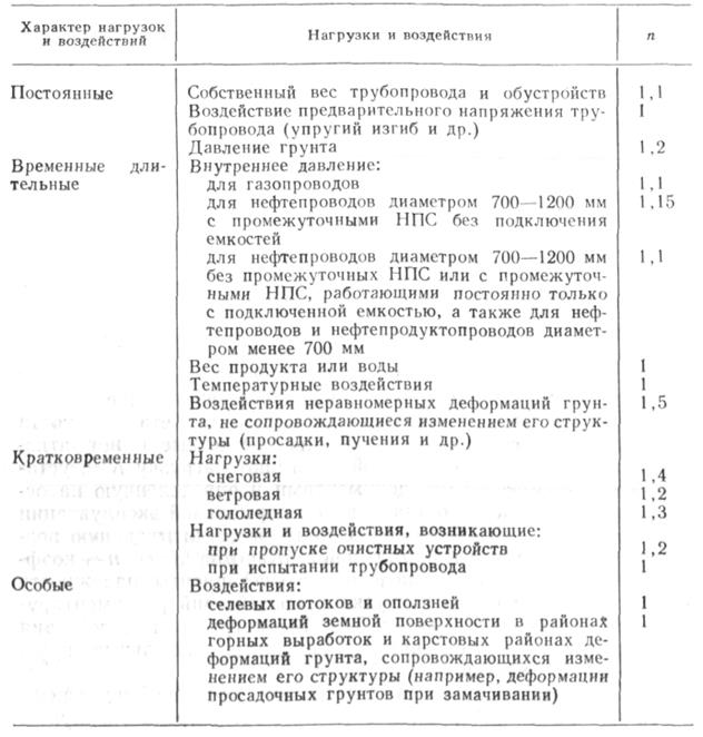 Внутренние усилия в трубопроводных конструкциях появляются от внешних и внутренних нагрузок. Причем эти нагрузки изменяются в зависимости от характеристик окружающей трубопровод среды, параметров перекачиваемого продукта и т. п. К нагрузкам относят внутреннее давление продукта в трубопроводе, вес конструкций, оборудования, давления грунта, снега, ветра, испытательные нагрузки и т. п. К воздействиям относят предварительное напряжение элементов, изменение температуры, просадки оснований, обусловленные коренным изменением структуры грунта (просадки в районах горных выработок, разжижение грунта, оползни, и т. п.), сейсмические явления. Для линейной части трубопровода основными являются из нагрузок — внутреннее давление, давление грунта, собственный вес труб и продукта, а из воздействий — изменение температуры, просадка и разжижение грунта, давление оползающих грунтов.