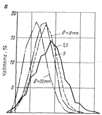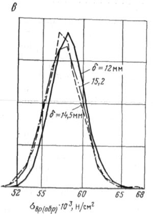 результаты испытаний образцов, вырезанных из труб. По Остановимся далее на распределении пределов прочности материала труб и на факторах, оказывающих на них влияние. Были обработаны данные лабораторных испытаний около 70000 образцов, вырезанных из труб различных диаметров и толщин стенок б. Материал труб — сталь 17Г1С, размеры образцов