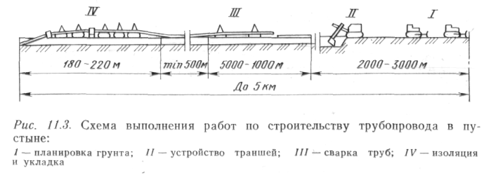 Линейные работы в условиях пустыни выполняют расчлененно-специализированным методом с соблюдением одного важного условия: все операции, начиная с подготовки трассы и кончая засыпкой уложенного трубопровода, выполняются на протяжении не более 2—5 км в зависимости от погоды и состояния песков. Это требование диктуется в основном тем, что частые в пустыне ветры перемещают большие массы