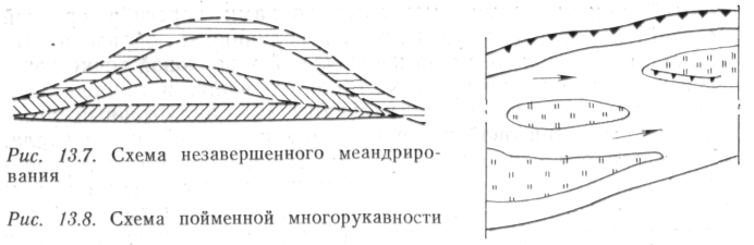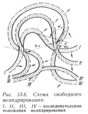 Ограниченное меандрирование является дальнейшим развитием руслового процесса побочневого типа и выражается в сползании слабо выраженных излучин (углы разворота до 60°) при сохранении ими своих размеров и форм (рис. 13.5). Количественно ограниченное меандрирование определяется следующими измерителями, получаемыми по крупномасштабным картам, материалам аэрофотосъемки, а также на основе специальных съемок: шагом излучины А™ (расстояние по прямой между двумя смежными точками перегиба средней линии меженного русла); углом разворота излучины а, образованным двумя касательными, проведенными через те же точки перегиба, ограничивающие излучину; шириной меженного русла b; шириной пояса меандрирования В (ширина русла плюс наибольшая ширина пойменного массива); скоростью сползания излучины уи (отношение длины пути, пройденного точкой перегиба русла, к периоду времени, за который этот путь пройден). Скорость сползания излучин определяется по результатам разновременных съемок. При свободном меандрировании в отличие от излучин, образующихся при ограниченном меандрировании, при котором наблюдается их сползание без закономерного изменения размеров и плановых очертаний, излучины проходят определенные циклы развития (рис. 13.6). В начальной стадии развития излучины (при а<90°) сползают вниз по течению по схеме ограниченного меандрирования, но в отличие от него одновременно и постепенно увеличивают угол разворота. По мере увеличения угла разворота сползание излучины замедляется, но ускоряется ее разворот. Развитие излучин завершается сближением подмываемых берегов смежных излучин и прорывом образовавшегося между ними перешейка. Основные признаки свободного меандрирования — однорукавное русло в широкой пойме со староречьями, с грядовым рельефом поверхности, представленной сериями дугообразно изогнутых гряд и ложбин между ними (вееров перемещения русла); наличие излучин, находящихся в разных стадиях развития, и скопление наносов у выпуклых берегов, имеющих вид пляжей. У вогнутого берега одна — три (редко более трех) плесовые лощины. Перекаты, расположенные у точек перегиба русла, протягиваются между оконечностями пляжей, что нередко приводит к образованию у пляжей низовой косы затона. Из количественных характеристик, получаемых по крупномасштабным картам и аэрофотоснимкам или по материалам специальных изысканий, используются следующие: шаг излучины Яи — расстояние по прямой между двумя смежными точками перегиба средней (осевой) линии русла; угол входа в излучину аь образованный вектором, направленным по касательной в верховой точке перегиба к средней линии русла в сторону течения, и линией шага излучины; угол выхода из излучины иг — аналогичный угол, построенный в низовой точке перегиба к средней линии русла. Угол разворота излучины a = ai+«2. План излучины в горизонталях или изобатах имеет отметки наинизших точек плеса и точек верхового и низового перекатов. Скорости развития излучин устанавливаются на основании совмещения карт разных лет съемки или сопоставления в натуре прежних съемок с современным положением излучины. Главное в оценке русловых деформаций при свободном меандрировании — установление тенденций планового развития излучин и связанного с этим изменения их глубин. Под незавершенным меандрированием пон