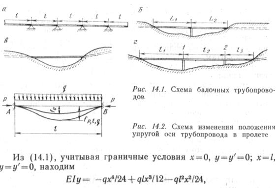 Схемы балочных трубопроводов без компенсации удлинений показаны на рис. 14.1. На рис. 14.1, а — многопролетный трубопровод неограниченной длины, на рис. 14.1,6, в, г — одно-, двух- и трехпролетные переходы. При числе пролетов более четырех трубопровод можно рассматривать как многопролетный. Расчетная схема однопролетного трубопровода изображена на рис. 14.2. Чтобы определить напряженное состояние многопролетного трубопровода, достаточно выяснить напряженное состояние одного пролета, ибо все пролеты находятся в одинаковых статических условиях. Напряженное состояние труб изменяется от начального, возникающего в незаполненном трубопроводе в период монтажа, до эксплуатационного. Можно указать на следующие основные моменты. Трубопровод смонтирован и не заполнен продуктом. В этот период его температура равна t0, а интенсивность вертикальной распределенной нагрузки q0 соответствует весу единицы длины пустого изолированного трубопровода. Трубопровод заполнен продуктом, давление которого р = 0. Температура продукта, а значит, и труб может быть t = to, t> ><0, t<_tn. Интенсивность вертикальной распределенной нагрузки в период эксплуатации увеличивается на дп, т. е. на вес продукта: