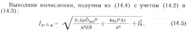 где Ркр = 4л2£///2— эйлерова критическая сила. Значения fp,t,4 и Р получены без учета сжатия материала труб. На самом же деле под действием Р трубы сжимаются и прогиб будет меньше, чем полученный по (14.5), и соответственно будет отличаться от значения, вычисленного по (14.6). Учитывая сжатие труб в пролете /, находим