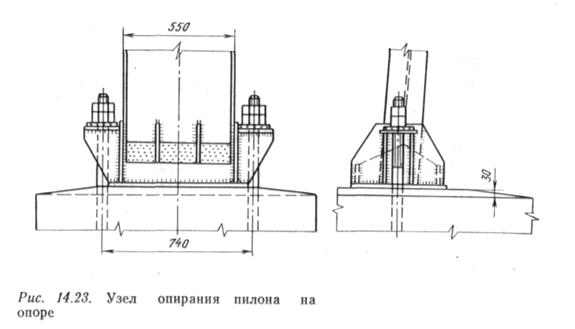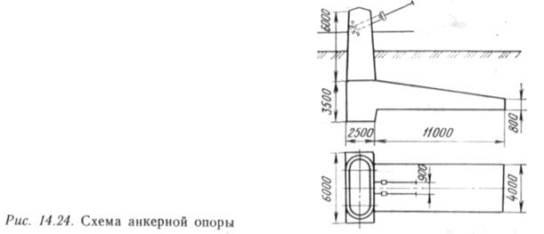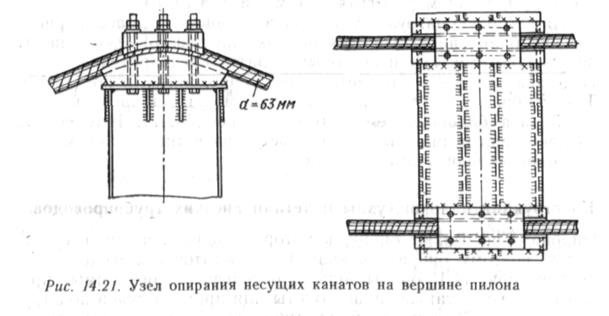 Это достигается опиранием каната по круглой поверхности радиусом 50—70 см. Опирание пилона на опору можст быть выполнено в форме Іпарнира соверіпснного (рис. 14.22, а) или несовсрпіснного типа (рис. 14.22, б), а также с жестким закреплснием (рис. 14.23). Как несущие, так и ветровые канаты или оттяжки крепятся в анкерных опорах. При расчете этих опор учитывают удерживающую силу грунта, включая и присос. Одна из конструктивных схем анкерной опоры изображсна на рис. 14.24. Анкерные опоры могут быть выполнены и в виде железобетонных, хорошо армированных плит (коэффициент армирования до 3%), заглубленных в грунт (рис. 14.25). Несущая способность таких опор определяется в основном пассивным отпором грунта и присосом (для временных нагрузок). Узлы крепления (подвесного трубопровода) изображены на рис. 14.26 (двухтрубный персход). Здесь же на трубах виден пешеходный мостик. Концы несущих канатов заделывают в специальный стальной стакан и заливают их цинком (рис. 14.27). Перед заливкой проволоки каната расплетаются, чем обеспсчиваются полное захватывание их расплавленным цинком при заливке и высокая надежность заделки. Тсмпература заливае-мого цинка 430—450° С. Date: 2015-06-07; view: 825; Нарушение авторских прав |