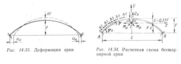 где Мя — балочный момент, например, при равномерно распределенной нагрузке Мд = дх2/2. Знаки М0 и <Эо приняты по схеме рис. 14.35, эти величины определяются по (14.50) и подставля-ются в (14.56)—со своими знаками. Сумма 27/ также определяется с учетом знаков при расчете составляющих Н по формулам (14.50), (14.53), (14.54) и (14.55). В заключение за-мстим, что основными являются две расчетные схемы для трубоироводной арки: