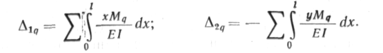 где бц, й|2)..., бзз — перемещсния рассматриваемого сечения от одной из сил в направлении к другой (при единичных значениях сил); АІ7, Д2д, А3д — перемещения того же сечения арки от внешних нагрузок, или, иначе, грузовое перемещение. Если расположить начало координат х, у в упругом центре С, то, как показано в строительной механике, перемещения 6І2 =