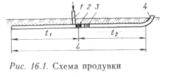 Очистка продувкой осуществляется до врезки линейной арматуры (кранов, задвижск), а также других узлов, мешающих проходу очистного поршня. Крупные переходы через водиыс преграды очищают и испытывают отдельно. Продувка воздухом может выполняться независимо от того, закончено строитсльство других участков или нет, т. е. любой готовый участок трубопровода может быть сразу же очищен. Очистка газом требует больших объемов газа, ІІоэтому она можст выпол-няться Іюследовательно по мере ввода участков от начальной точки газопровода по направлению к конечной. Можно исполь-зовать также и параллельные газопроводы, если они находятся рядом с вновь строящимся трубопроводом. Для продувки трубопровода требуются болыіюй расход и высокое давление воздуха, чтобы давление на поршень обеспе-чивало его движение со скоростью до 60 км/ч. Ни одна из имеющихся конструкций передвижных компрессоров не может обеспечить столь большой расход воздуха при давлении до 0,6 МПа. Поэтому все схемы продувки включают два участка трубопровода — накопитель воздуха (иначе его называют реси-вером) и продуваемый участок. На рис. 16.1 изображена схема продуваемого участка трубопровода длиной Ь. Участок Ь де-лится на два длиной 1\ и /2. Один из них (участок /І) используется в качестве баллона -накопителя (ресивера),
