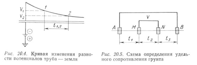 рт — удельное электрическое сопротивление трубопровода (для •стали рт = 0,135 Ом-мм2/м); Дп, /)вн — наружный и внутренний диаметры трубы; Ѵ\ и Ѵ2 — разности потенциалов труба -земля в точках /, 2 (рис. 20.4):