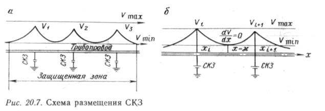 где ѵ. — координаты точки с минимальным защитным потенциалом. Распределение потенциалов и токов описывается кривыми, изображенными на рис. 20.8, а и 20.8, б соответственно. Ток СКЗ будет складываться из тока иравого и левого плечей за-щитной зоны: