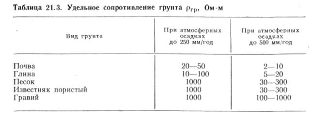 где п — глубина заложения анода. На величину /?а главным образом влияет значение удель-ного сопротивления грунта ргр, которое в огромной мере зави-сит от влажности, количества растворенных в воде солей. По-этому заземлители размещают на участках и глубине, обеспечи вающей наименьшее удельное сопротивленис грунта (табл.21.3). -