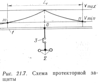 При расчете должна быть определена длина участка трубопровода, защищаемого одиночным протектором или группой протекторов. Рассмотрим схему, изображенную на рис. 21.7. Допустим, что в грунте установлен протектор (или группа) 2, который соединен кабелем 3 с трубопроводом /. Вследствие того что протектор изготовлен из материала, обладаюіцего более отрицательным потенциалом по сравнению с потенциалом материала трубопровода, в точке подсоединения О разность потен-циалов будет максимально допустимой Ѵтах. По мере удаления от точки 0 эта разность будет уменьшаться. В точках т, п она станст равной минимально допустимой Ѵтіп- Расстояиие Ь\ между точками т и п можно считать максимальной длиной участка трубопровода, защищаемого одним протектором. Пусть электродная разность потенциала протектора по отношению к электроду сравнения Ѵпр<Ѵтах, переходное сопротивление одиночного протектора Кп. пр; /?в* — входное сопротивление тру-бопровода, т. е. сопротивление, оказываемое трубопроводом, имеюіцим на изоляции повреждения, входящему в него току, Кс. пр — сопротивление кабеля, соединяющего протектор с тру-бопроводом. Тогда, учитывая естественную разность потенциа-лов труба — земля Ѵе, силу тока протектора, найдем по закону Ома