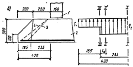 Рис.17. К расчету фундаментной плиты с угловыми вырезами а – план плиты; б – поперечное сечение плиты; в – схема реактивного давления грунта; 1 – стена подвала; 2 – фундаментная плита; 3, 4 – расчетные наклонные сечения