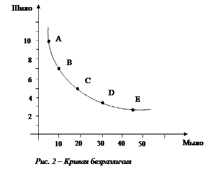 Перенесём эти данные на график и «соединив» точки A, B, C, D, E получим кривую безразличия (рис. 2) – геометрическое место точек, каждая из которых отражает комбинацию товаров, потребление которых приносит потребителю одинаковую общую полезность