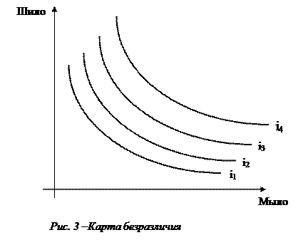 «Соединив» точки A, B, C, D, E получим кривую безразличия – геометрическое место точек, каждая из которых отражает комбинацию товаров, потребление которых приносит потребителю одинаковую общую полезность. Совокупность кривых безразличия при разном уровне удовлетворения потребностей называется картой безразличия (рис. 3).