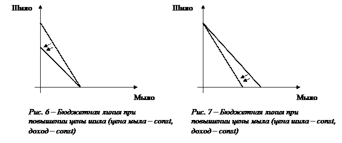 Изменение цены на один из товаров при постоянстве дохода и цены другого товара будет выглядеть как поворот бюджетной линии (рис. 6 и рис. 7).