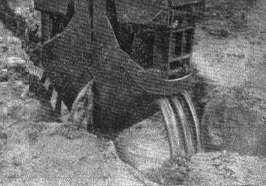 а) б) в) Рис. 10. а) - разработка траншеи плоским грейфером; б) - вытекание глинистой суспензии из плоского грейфера при разработке траншеи; в) - выгрузка грунта из плоского грейфера в автомобиль-самосвал.