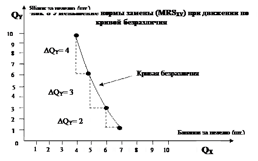Предельная норма замещения измеряет желание потребителя обменять один товар (Y) на каждую единицу другого товара (X), при этом не приобретая и не теряя полезность. Кривизна кривой безразличия изображенной на рис. 8 показывает, что количество Y, от которого потребитель хочет отказаться ради еще одной единицы X, уменьшается по мере увеличения количества X, замещающего Y в наборе. Экономисты исходят из того, что потребитель остается на одно и той же кривой безразличия, если не теряет и не приобретает полезности при отказе от потребления некоторого количества товара Y (ΔQY), чтобы получить еще одну единицу товара X (ΔQX=1). Количество товара Y, которое будет обменено на единицу товара X, между любыми двумя точками на кривой может быть записано как (ΔQY/ΔQX). Это наклон кривой безразличия, который показывает готовность потребителя отказаться от единиц товара Y для получения единиц товара X. Но наклон кривой безразличия отрицателен. Такой подход к рассмотрению MRSXY приводит к получению отрицательного числа. Поэтому предельная норма замещения это произведение наклона кривой безразличия и –1. Кривизна кривой безразличия на рис.8 отражает уменьшающиеся предельные нормы замещения Y на X. Предельная норма замещения между точками М1 и М2 равна 4. Это количество Y, от которого потребитель отказался бы ради дополнительной единицы X. Предельная норма замещения равная 4, означает, что потребитель был бы готов отказаться от 4 яблок в неделю, чтобы получить на один банан больше, оставаясь на данной кривой безразличия. MRSXY=4 при потребительском наборе, содержащем 10 яблок и 4 банана в неделю (набор М1). Далее предполагают, что потребитель обладает набором, представленным точкой М2. У него появилось желание отказаться только от 3 яблок в обмен на еще один банан в неделю, оставаясь на той же кривой безразличия. Предельная норма замещения уменьшилась, когда потребитель перешел от набора М1 к набору М2, так как кривая безразличия становится более пологой по мере того, как X замещает Y вдоль кривой. Выпуклая форма кривой безразличия (по отношению к началу координат) означает, что по мере уменьшения яблок и увеличения бананов в наборе количество яблок, которое потребитель хочет обменять на дополнительное число бананов, уменьшается. Имея недельный набор М3 (3 яблока и 6 бананов) потребитель желал бы отказаться только от двух яблок, чтобы получить еще один банан в недельном наборе. В таблице 6 обобщены данные для вычисления MRSXY в различных точках кривой безразличия