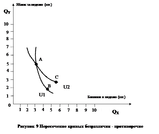 Свойство 2. Две кривые безразличия не могут пересекаться. Экономисты исходят из предположения о возможности пересечения кривых безразличия, показанных на рис.9 Если набор, представленный точкой А, был бы характерен для обеих кривых U1 и U2, где U2> U1, это означало бы, что потребитель не делает различия между А и В, а также между А и С. Отсюда следует, что он не делает различия между В С. Однако набор В содержит меньшее количество X и Y, чем набор С. Из этого должно следовать, что он предпочитает набор С набору В. Это противоречие, поскольку он не может одновременно предпочитать один набор другому и не делать различия между ними. Тогда (по определению кривой безразличия – линии равных полезностей), В ~ А, С ~ А. Согласно предположения II (транзитивности) В ~ С, но этого не может быть, так как по предположению III В Таким образом, две кривые безразличия не могут иметь общую точку, так как один набор товаров не может характеризоваться двумя различными уровнями полезности. Свойство 3. Кривая безразличия может быть проведена через каждую точку в пространстве товаров (согласно предположению о сравнимости). Таким образом, экономисты изображают множество кривых безразличия – карту безразличия (Рис.7) Свойство 4. Предельная норма замещения уменьшается при движении вдоль кривых безразличия. Кривые безразличия выпуклы к началу координат. Под предельной нормой замещения Y на X (MRS[13]XY) экономисты понимают количество товара Y, от которого потребитель отказался бы, чтобы получить еще одну единицу товара X, сохраняя общую полезность товарного набора (оставаясь на данной кривой безразличия). Предельная норма замещения определяется как положительное количество товара Y, от которого потребитель желает отказаться ради дополнительной единицы X